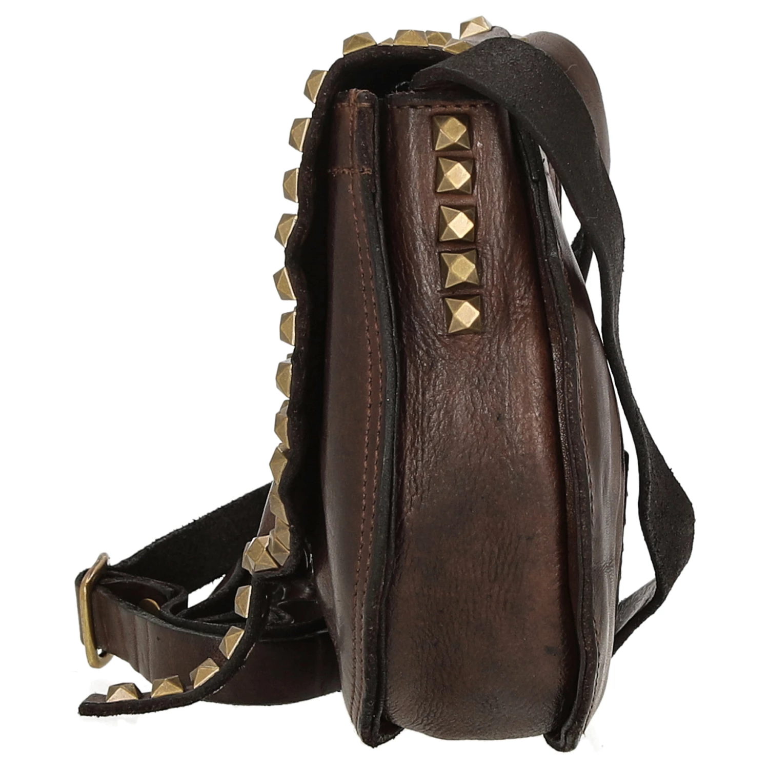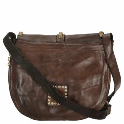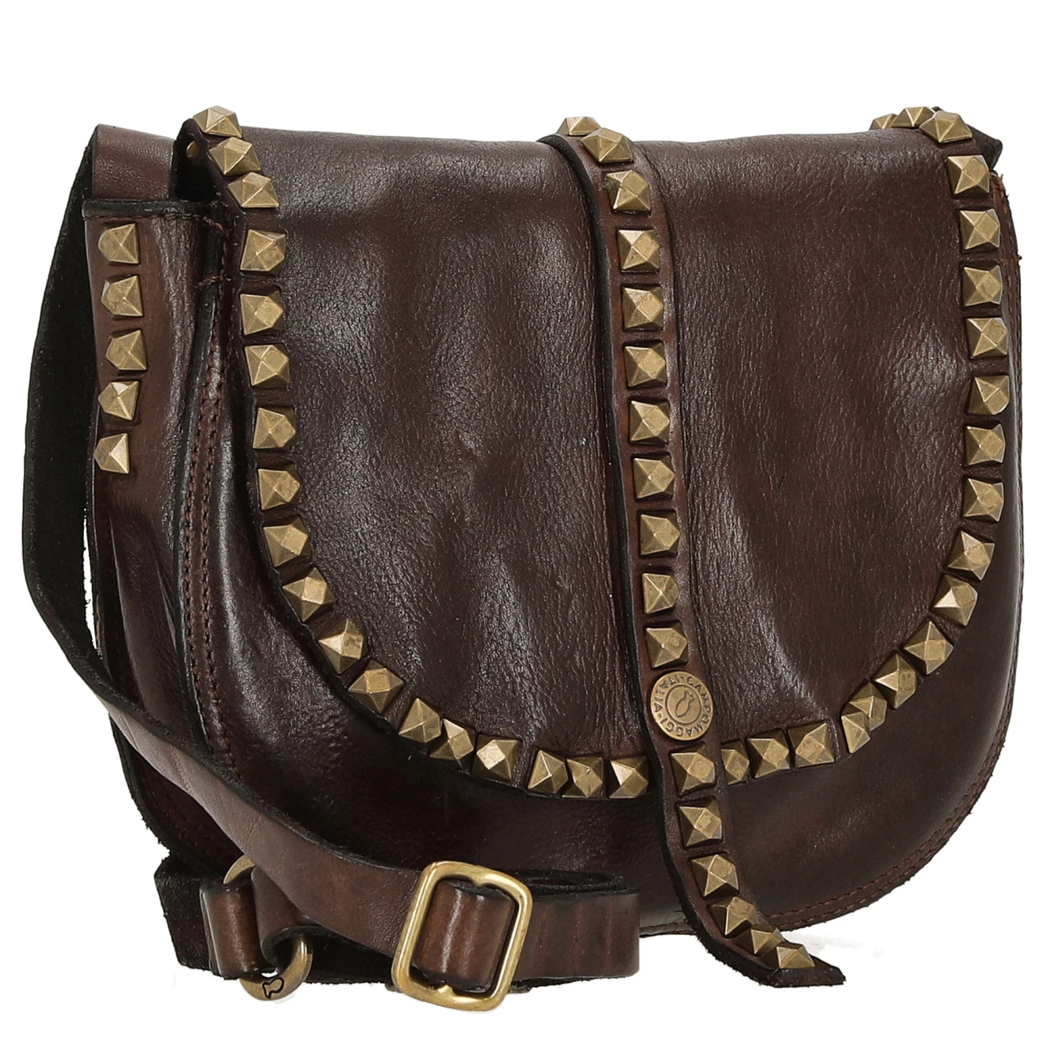 Diese Umhängetasche aus der Linie Gila von Campomaggi ist mit facettierten messingfarbenen Ziernieten versehen, die in einer durchgehenden Reihe angebracht sind und die Form und Linie jedes Modells betonen. Made in Italy.